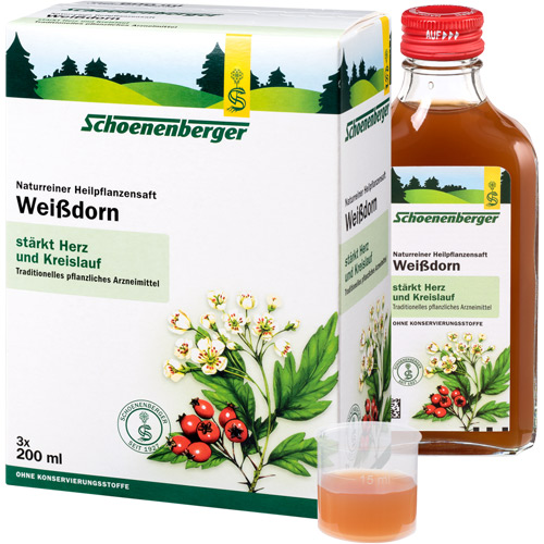 Naturreiner Heilpflanzensaft Weißdorn wird traditionell zur Unterstützung der Herz-Kreislauf-Funktion eingesetzt. Schoenenberger Heilpflanzensäfte sind reine Presssäfte aus frischen Pflanzen ohne Zusatz von Zucker, Alkohol, Konservierungsmitteln oder anderen, oft unerwünschten Stoffen. Durch völlig natürliche Vorgänge können sich im Weißdorn-Frischpflanzen-Presssaft Ausflockungen bilden, welche die Qualität jedoch in keiner Weise beeinträchtigen. Diese Stoffe lassen sich vor Gebrauch aufschütteln.