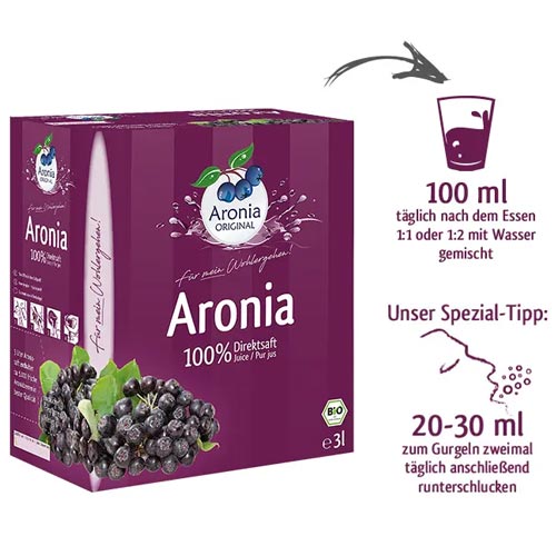 Getreu dem Leitsatz „Jeden Tag ein bißchen Aronia“ empfehlen wir 100 ml Aronia-Direktsaft täglich nach dem Essen einzunehmen: Entweder pur oder mit einem guten Wasser für eine köstlich-fruchtige und durststillende Saftschorle gemischt. Zudem kann der Saft als Basis für köstliche Smoothies, süße Soßen oder als fruchtige Komponente in herzhaften Speisen verwendet werden.