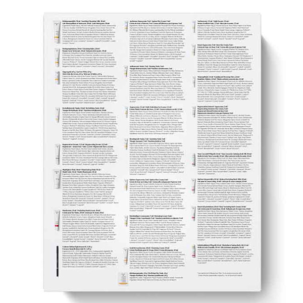 Reinigungsmilch 30 ml, Revitalisierende Maske 10 ml, Regeneration Tagescreme 5 ml, Rosen Körperbalsam 10 ml, Augencreme 2,5 ml, Rosen Tagescreme 5 ml, Reinigungsbalsam 20 ml, Beruhigende Maske 5 ml, Regeneration Serum 12,5 ml, Quitten Tagescreme 5 ml, Tönungsfluid 2,5 ml, Quitten Körpermilch 10 ml, Lippengold 4,9 g, Gesichtswaschcreme 10 ml, Reichhaltige Maske 5 ml, Aprikosen Tagescreme 5 ml, Moor Lavendel Pflegeöl 10 ml, Reinigungsmaske 10 g, Nachtserum 2,5 ml, Handcreme 20 ml, Aufbauende Maske 5 ml, Eyebrow Definer 01 1,05 g, Schlehenblüten Pflegeöl 10 ml, Illuminating Fluid 30 ml.