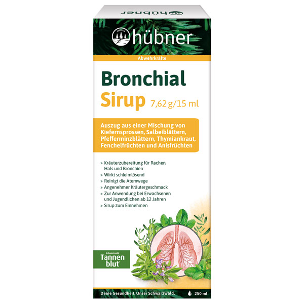 Seit 1922 überzeugt der Bronchial-Sirup aus dem Schwarzwald und unterstützt den menschlichen Körper. Der hübner Bronchial-Sirup als Traditionsprodukt und natürliches Arzneimittel setzt sich aus zahlreichen Kräutern zusammen und verhilft besonders zur Schleimlösung in Rachen, Hals und Bronchien. Der Sirup ist außerdem vegetarisch und frei von Alkohol, Lactose und Gluten.