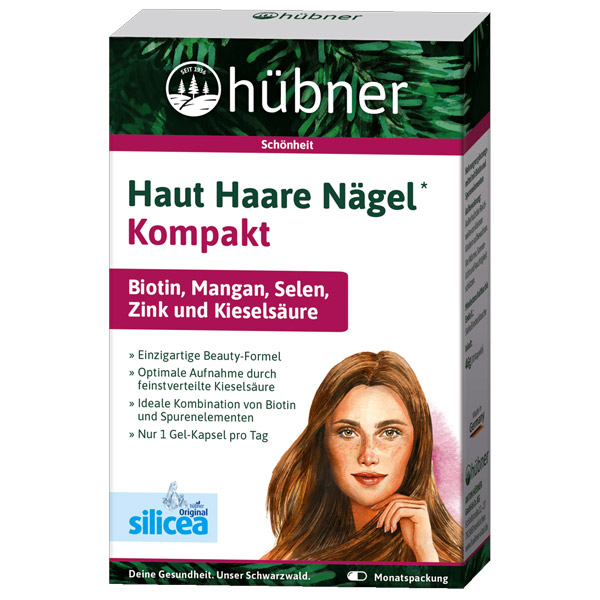 hübner® Haut Haare Nägel Kompakt Kapseln enthalten Silicium (Kieselsäure) in reiner, natürlicher Form mit Zink, Mangan, Selen und Biotin.