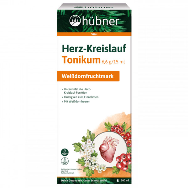hübner® Herz-Kreislauf-Tonikum ist eine Flüssigkeit, die aus naturbelassenem Weißdornfruchtmark sowie frisch vermahlenen Weißdornbeeren besteht.