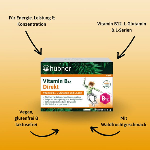 Die Extraportion Energie: Vitamin B12, kombiniert mit zwei ausgewählten Eiweißbausteinen und Waldfrucht-Geschmack, für neue Energie, Konzentration und zur Verringerung von Müdigkeit*. (Früher: Hübner Vitamin B12 Direktsticks)