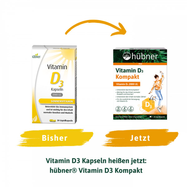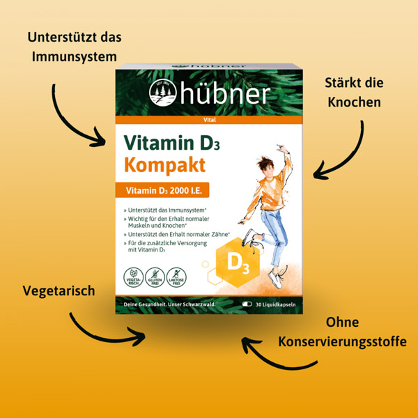 Vitamin D3 ist eine fettlösliche Verbindung, die in den hübner® Vitamin D3 Kompakt Kapseln in Olivenöl gelöst wird. Die Flüssigkeit wird von einer Kapsel umschlossen, was den Verzehr vereinfacht.